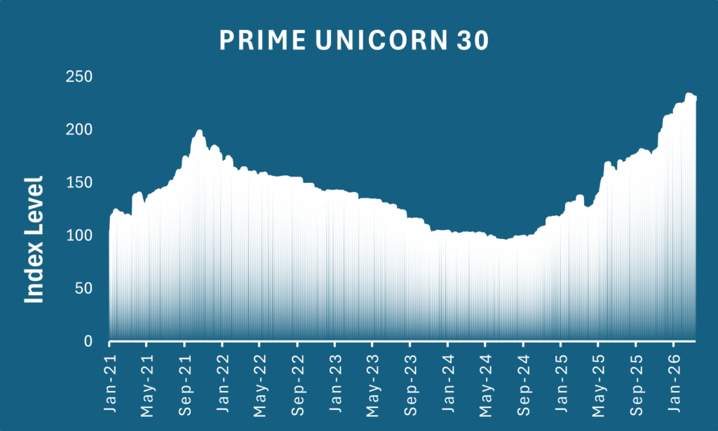 The Prime Unicorn 30 Index closed at 229.61 on Apr 1, down 0.1% vs 229.77 on Mar 25.