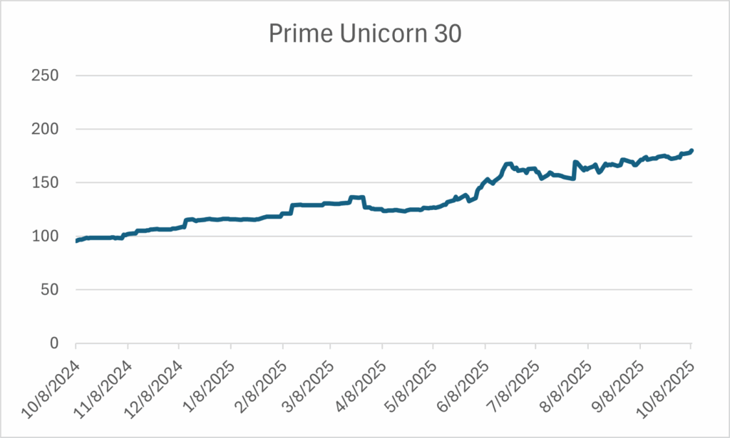 The Prime Unicorn 30 Index closed at 180.15 on Oct 8, up 3.8% vs 173.54 on Oct 1.