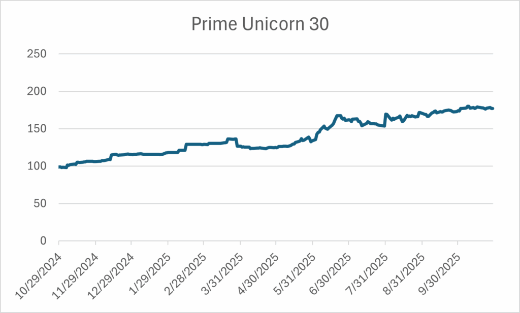 The Prime Unicorn 30 Index closed at 177.22 on Oct 29, up 0.2% vs 176.95 on Oct 22.