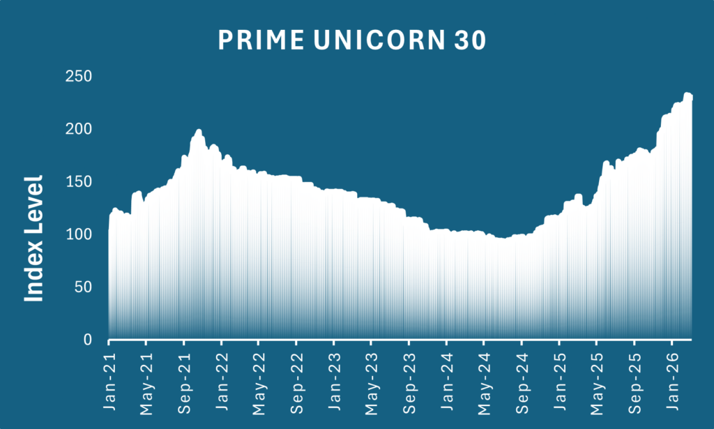 The Prime Unicorn 30 Index closed at 229.77 on Mar 25, down 0.5% vs Mar 18.