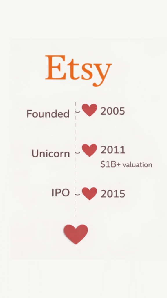Etsy reached unicorn status in 2011 following a Series F funding round that valued the company at over $1 billion. At the time, the broader e-commerce landscape was dominated by large-scale retailers, yet Etsy carved out a differentiated niche centered on authenticity, creativity, and small-business empowerment.